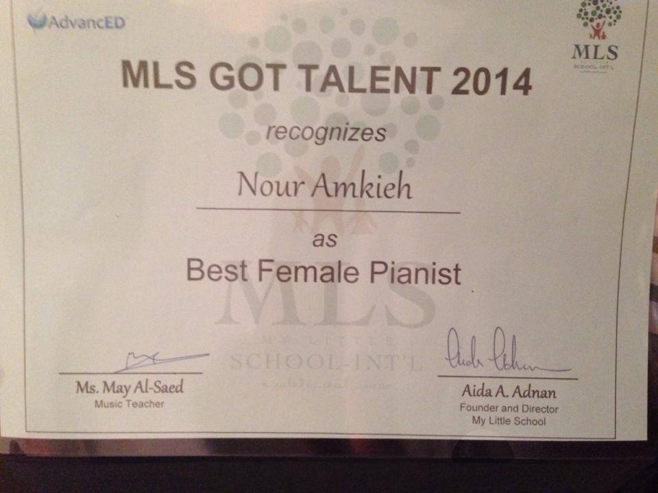 My sincere congratulations go to my lovely student Nour Amkieh! 6 months ago with nothing more than a passion for piano and eagerness to learn, Nour Amkieh embarked on a journey of discovery, challenge and eventually success. She is now recognized by MLS as the BEST FEMAIL PIANIST! I am so proud of her.